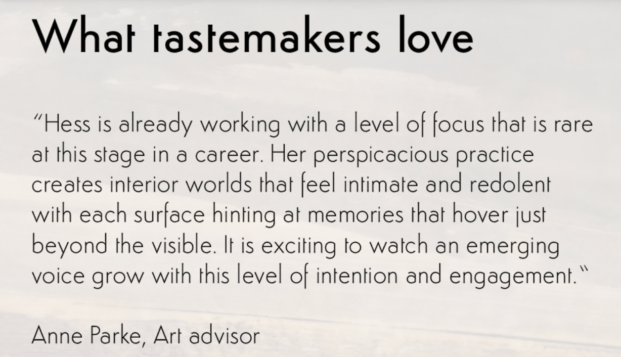 This week carries real momentum because ArtCube released its 2026 Discoveries Report, and nine artists I have previously championed in this newsletter were recognized! ArtCube also invited me to contribute and I was quoted discussing the work of Eloise Hess. Here is the excerpt: