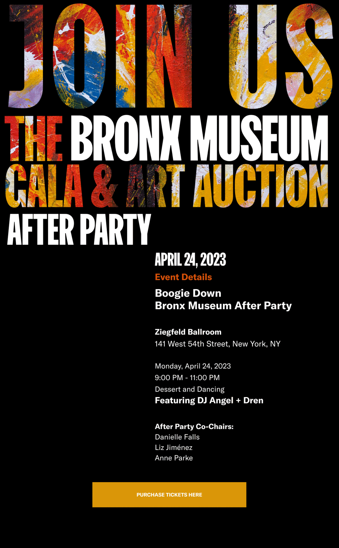 On Monday, April 24 from 9-11pm, I am co-chairing the Bronx Museum Gala afterparty. There will be dancing and dessert and a lot of exuberance! If you or your company is interested in purchasing a table for the gala, please contact me for a discounted rate. Please use this link to purchase tickets for the after-party: https://bronxmuseum.app.neoncrm.com/np/clients/bronxmuseum/eventRegistration.jsp?event=21&